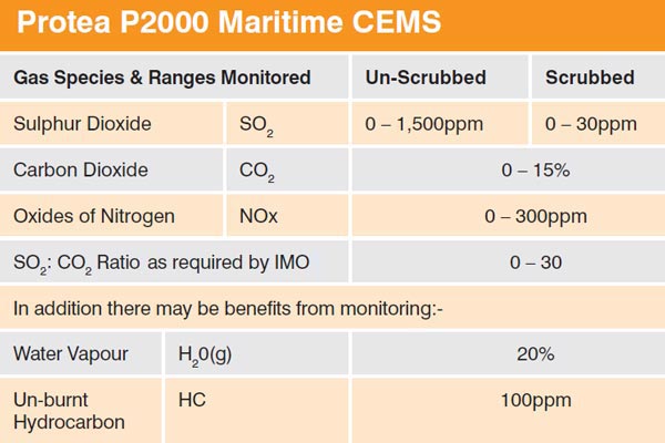 The Protea 2000 emissions monitoring system comprises up to 8 exhaust mounted analysers, each with automatic verification facilities. Emissions data from the entire system is securely managed and displayed at a dedicated Classification Society approved panel PC, with outputs to networks, control systems, and reporting facilities.